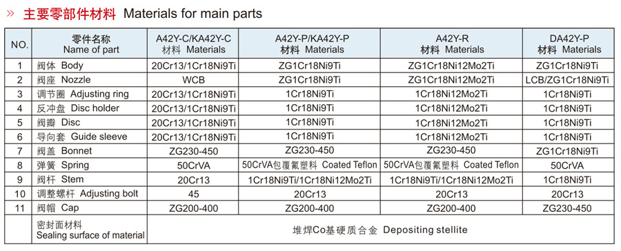 A42Y-C型适用于工作温度≤300℃空气、石油气、液体等介质的设备和管路上,A42Y-P型及A42Y-R型适用于工作温度≤200℃有腐蚀性的介质的设备和管路上作为超压保护装置。